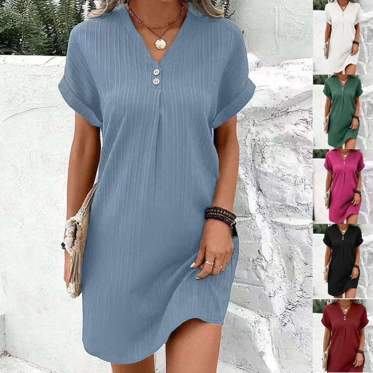 Letnia cienka sukienka z krótkim rękawem i dekoltem w serek